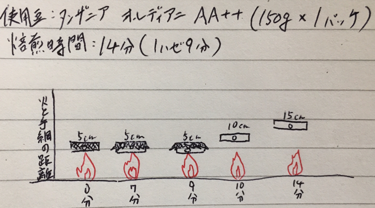 焙煎の進行具合で火と手網の距離を